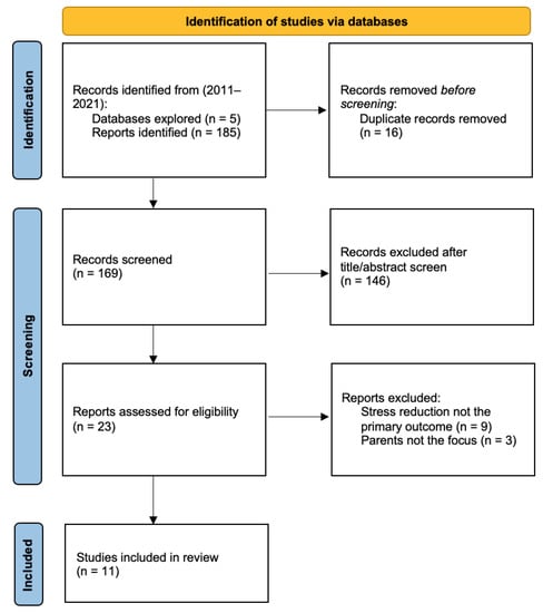 Studies were excluded if stress reduction was not a primary outcome variable or if intervention results were not a focus of the study. Studies older than ten years were also excluded to ensure up-to-date research was collected. We drew this cut-off because the latest version of the Diagnostic and Statistical Manual of Mental Disorders, 5th edition (DSM-5) was published in 2013, where the definition and understanding of autism were updated [,]. One hundred eighty-five articles were found using the search terms ‘stress reduction interventions’, ‘parents of children with autism’, and ‘ASD’. Of these 185, 16 duplicates were removed. A further 146 articles were removed after applying exclusion criteria during the title and abstract screening. A final 12 were excluded during full-text screening, whereby 11 articles remained. The PRISMA flow diagram for this process is represented in Figure 1.