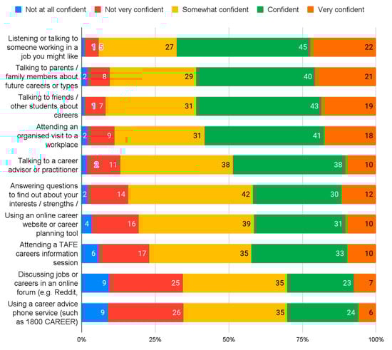 There is now a large strand of social justice-focussed careers research seeking to smooth out social divisions in the transition into the labour force, and which emphasises the interplay of structure and agency and rejects the idea of a free and rational choice-making individual [,,,] in ways similar to critical youth research more broadly []. Our aim has been to add to this literature by locating formal careers guidance interventions in a wider context that captures a fuller range of careers advice experiences, as suggested in the words of young people. Drawing on data from a multi-method study involving Australian young people, we have pointed to an interconnected range of activities that young people undertake or are exposed to which form what we refer to here as the ‘careers information ecology’. Our data illustrates that young people have variable confidence in the effectiveness of each. While nearly half of young people feel confident in formal careers guidance, a much higher degree of confidence was observed in talking to friends and family and in talking to people from the industry where the young person wants a job. If we are to take young people’s voices seriously and see them as ‘legitimate knowers’ [] of what is right by and useful for them, the implications of this finding must be considered.