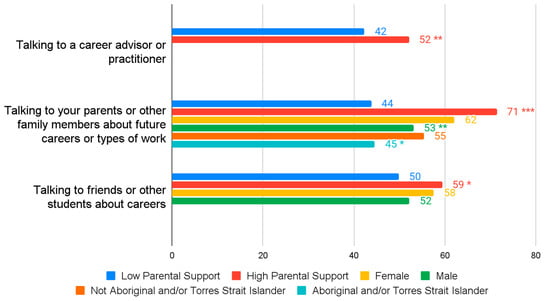 Furthermore, there are indications that these differences extend beyond the family context to shape the extent to which young people seek advice from friends or peers. Talking to friends or other students about careers was the most common advice-seeking activity among respondents who received low parental support. While half of these young people sought advice in this manner, this was still lower than respondents who received high parental support (50% vs. 59%; p = 0.01). Although only bordering on significant, it appears that young women are also likelier to seek careers advice via this more informal, social avenue than young men (58% vs. 52%; p = 0.08). Combined with the observed gender difference in obtaining advice from parents, young women’s access to advice from informal sources represents a clear inequity. Such concerns are echoed in recent research from Gleeson and colleagues, which found that over half of young women ‘did not believe that their family, friends, culture, or background would help them achieve their career choices’ [] (p. 13).