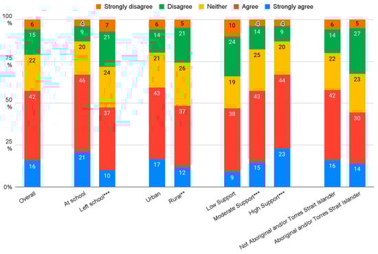 While the majority of young people across the sample suggested that they are likely to do so, the proportions of those who ‘strongly disagree’ or ‘disagree’ are markedly higher for those groups who are traditionally more socially marginalised, and agreement or strong agreement is markedly lower for such groups. For instance, the responses were consistent with well-documented material inequalities between rural and urban located youth [,]. Young people living rurally displayed a significantly lower average intention to seek careers advice in the next 12 months than those living in major cities (t [1108] = 2.7; p = 0.004). Just under half (48%) of all rural young people surveyed agreed or strongly agreed that they would seek advice, compared with 60% of urban respondents. Similarly, a gradient appears in respect to the impact of parental support, where those receiving low parental support were less inclined to seek advice than young people receiving a moderate level of support (t [716] = −4.8; p < 0.001) or high level of support (t [713] = −7.3, p < 0.001). While 47% of young people with low support agreed or strongly agreed that they were likely to seek advice, this rose to 58% for those with moderate support, and 67% for those with high support. Finally, young people who identified as Aboriginal and/or Torres Strait Islander were less inclined to seek careers advice than those who did not identify as such (t [1102] = 1.7, p = 0.04), though the difference was borderline significant, likely due to sample size constraints. This apparent gap is illustrated by the proportion of Aboriginal- and/or Torres Strait Islander-identifying respondents who intended to seek advice in the next 12 months (44%) when compared to non-Indigenous respondents (66%).