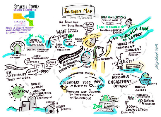 In the first session, participants engaged in discussions about barriers sexual and gender diverse youth face when accessing mental healthcare during the COVID-19 pandemic. These discussions were mapped by a graphic illustrator in a process called Journey Mapping to reveal the holistic interactions that participants encountered during the pre-engagement, engagement, and post-engagement stages of accessing services. The sessions were audio recorded and transcribed for analysis.