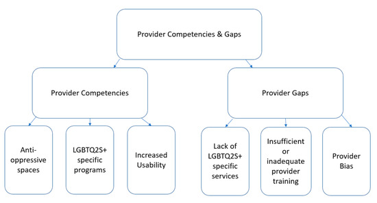 Themes addressing provider competencies included anti-oppressive spaces, LGBTQ2S+ specific programs, and increased usability due to virtual appointments/telemedicine. Themes addressing provider gaps were identified as lack of LGBTQ2S+ specific services, insufficient and/or inadequate provider training, and general provider bias. For a visual representation of themes, see Figure 2.
