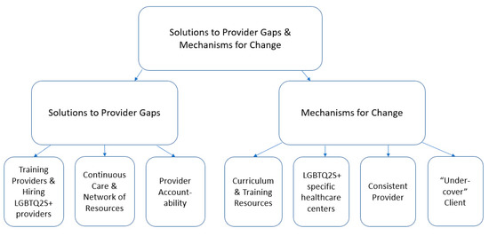 Study participants also proposed creating an LGBTQ2S+ specific healthcare center, and the addition of an MH provider who focuses on intake and would follow the patient throughout their journey when seeking care from beginning to end. This suggestion intends to increase accessibility of care for LGBTQ2S+ patients, create a centralized resource for various forms of healthcare, and improve the continuity of care a patient would experience.