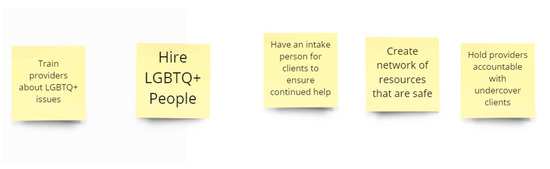 The following results highlight participant ideas for solutions to the identified provider gaps, as well as mechanisms for change. For a visual representation of these themes, see Figure 3. Youth represented their ideas visually and in writing using Miro, and the Miro board was then analyzed by the research team for themes. Young people in this study identified three solutions they believed would improve the cultural safety of LGBTQ2S+ youth when seeking MH services: training providers on LGBTQ2S+ issues and identities and hiring LGBTQ2S+ providers, ensuring patients experience continuous care and creating an extensive network of culturally safe resources, and holding providers accountable for upholding culturally safe services for LGBTQ2S+ individuals. These ideas were represented in Miro, as seen in Figure 4. They also described four mechanisms for change, including changing the curriculum and training resources for service providers, opening an LGBTQ2S+ specific healthcare center, introducing a provider at intake that stays with a patient throughout their care journey, and implementing “undercover-patient style” assessments to evaluate providers.