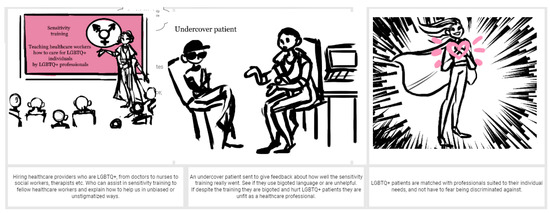 Proposed solutions and measures to ensure accountability to improve MH services and providers. This figure, created by participants, aims to demonstrate some of the changes to the current MH system proposed by the study participants. The first panel portrays the suggested increase in LGBTQ2S+ education for MH providers, the second panel illustrates an ‘undercover boss’ model of assuring provider accountability, and the third panel demonstrates positive outcomes for LGBTQ2S+ youth. Figure was generated in Miro, a cloud-based, online white-board used for the collaboration of small to mid-sized groups.