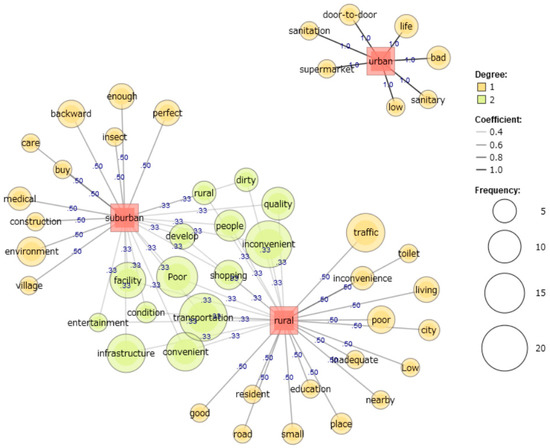 The results of the text mining analysis on Japanese students’ rural visit experiences are shown in Figure 3. Rural and suburban students had similar concerns, focusing on old age, education, and inadequate public services. Suburban students had more concerns about hazards, technology, driver’s licenses, population loss, and labor, while rural students focused on employment, supermarkets, activities, and bicycles. Urban students were more concerned with accessibility, lack of maintenance, culture, forests, and agriculture. Rural students focused on substantive issues, while suburban students were more concerned with the social status quo and population loss. Urban students were primarily concerned with access to rural areas (the routes to rural areas appear to be more complicated).