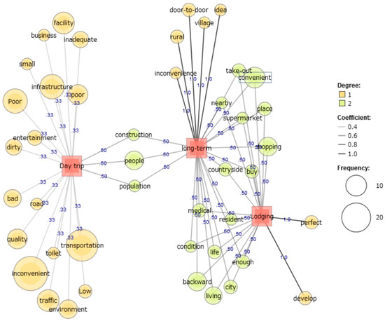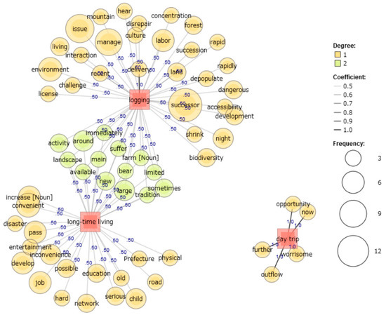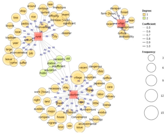 Furthermore, to understand the general impressions of and intention to live in rural areas among Japanese university students, the KH Coder 3 software was used for text mining, and a map of “co-occurrence” was obtained [73]. A co-occurrence network is a network representation method of the relationship between codes with similar appearance patterns. When creating the co-occurrence network, co-occurrence relationships with a Jaccard coefficient of 0.3 or higher were employed and drawn.