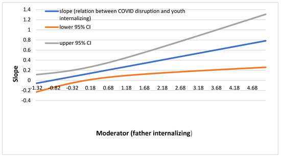 In examining the interaction between mother internalizing symptoms and COVID-19 disruption, omnibus tests of model fit showed that the data did not fit the model well, and the interaction term was not significant (model results and fit statistics for models that did not fit the data well or were non-significant are available from the corresponding author). For fathers, the interaction term was significant; paternal internalizing symptoms moderated the association between COVID-19 disruption and youth-reported internalizing symptoms such that the relation between disruption and increased youth perceptions of internalizing symptoms was stronger for fathers that reported higher levels of depression and anxiety. Figure 1 shows the regions of significance for this interaction effect, which plots the value of the moderator on the x-axis (father internalizing) against the slope of the relation between the predictor (COVID disruption) and youth reports of increases in internalizing symptoms (the outcome) on the y-axis. This type of plot allows us to see at what values of the moderator the slope is significant (e.g., where confidence intervals do not include zero), and is a more precise and nuanced interpretation of interaction effects beyond simple slope tests. The slope was significant and positive for all values of father internalizing above 0.06 SD from the mean, which represents 38% of the father respondents (see Figure 1).