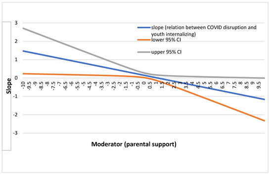 Although adolescence is typically a time when peer groups take on a larger role than parents in importance and influence in young people’s lives, our second hypothesis was only partially supported and our third hypothesis was not supported; our study found that parental support was a significant moderator in the relation between youth-reported disruption and perceived worsening of internalizing symptoms compared to before the pandemic, but the parental warmth and peer support moderation results were not significant. Furthermore, our regions of significance testing revealed that nearly half the youth in the sample reported levels of parental support that significantly and inversely moderated the relation between COVID-19 disruption and youth internalizing behaviors. Extant literature on parent–child relationships during the pandemic may explain why parental support plays a protective role during the pandemic. For example, higher levels of parental support are associated with lower levels of internalizing symptoms among adolescents across various cultural contexts (e.g., [69] in Qatar; [70] in Poland). Other researchers have documented decreases in parental support and positive parenting compared to before the COVID-19 outbreak, but they have also documented simultaneous declines in negative parent–child interactions [37]. In another study with 170 adolescents during the COVID-19 pandemic in the U.S., parent–child relationship characteristics impacted child adjustment in ways that were similar to pre-pandemic associations, regardless of pandemic-related stress [71], indicating a possible increased impact of positive parent–child relationship characteristics during the pandemic. Parent–child conflict resolution techniques during adolescence three years prior to the pandemic were also shown to impact young adult adjustment during the first year of the pandemic across multiple countries [42]. Our findings support the existing literature showing that the parent–child relationship continues to impact adjustment into middle and late adolescence, particularly during stressful events.