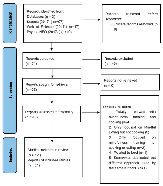 To illustrate the perspective of promoting home economics education with mindfulness, a review of the literature was implemented with a comprehensive paper extraction and screening process, as well as ensuring the quality of the selected research papers. The literature search covered research papers published within the most current trend of 5 years, starting from 2017 to 2022. The databases of Scopus (2017–Now), Web of Science (2017–Now), and PsychoINFO (2017–Now) were selected as they represent the most comprehensive sources for research in psychology and education. The article searches across the three databases were conducted in January 2023. The keywords and search terms were mindfulness and cooking, with the advanced search terms as “Mindfulness” AND “Cooking” OR “Cookery” OR “Meal Preparation”, as well as “Mindfulness” AND “Knitting” OR “Craftmanship”. All included papers had to be peer-reviewed, published in journals, including reviews but excluding conference proceedings, and written in English. Referencing from the PRISMA flow diagram (Figure 1 and Figure 2) [31], manual screening based on abstracts and titles was performed to exclude mindfulness-, crafting-, and cooking-irrelevant papers, as well as those that violate the eligibility criteria. Duplicated papers were also excluded from the screening process. Finally, all eligible papers were included in the full-text screening. Please refer to the Supplementary Materials File S1 for the PRISMA checklist for Scoping Review.