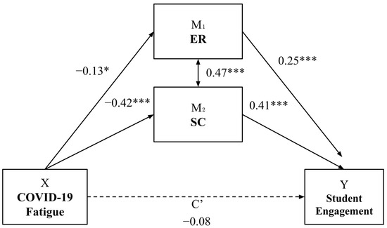 Parallel mediation model: COVID-19 fatigue and student engagement. Note: standardized coefficients are presented. * p < 0.05. *** p < 0.001.