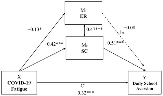 Parallel mediation model: COVID-19 fatigue and daily school aversion. Note: standardized coefficients are presented. * p < 0.05. *** p < 0.001.