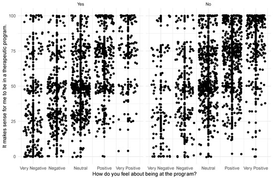 Participants were asked at admission to rate their agreement with the question, “It makes sense for me to be in a therapeutic program”, and 75 and above believed it made sense, while those below 75 were neutral or disagreed. This is the x-axis. The y-axis is the answers to the question, “How do you feel about being at this program?” The first question asks about whether they agree they should be in a program, and the second asks about being in this program in particular.
