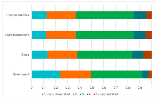 Considering the addressing and solving of discrimination, coaches were asked whether enough is being done to tackle discrimination in youth sports. Looking at the different stakeholders, we see that the respondents feel there is not enough being done when it comes to tackling discrimination and that academies, sports associations, clubs, and governments all have a large role to play in making youth sport more inclusive. At the governmental level, almost half of the respondents are very dissatisfied or dissatisfied with the current work on anti-discrimination in sports (n = 86). Only 10 people responded as being satisfied or very satisfied in this regard. On the sports stakeholder level, a similar picture was created. Most respondents were very dissatisfied or dissatisfied with the current anti-discrimination work of sport academies (n = 45) and sports associations (n = 55) as well as clubs (n = 66). Only sport clubs present a higher level of satisfaction, with a total of 16% of the respondents being satisfied or very satisfied with their current anti-discrimination work. Overall satisfaction per stakeholder is illustrated in Figure 1.
