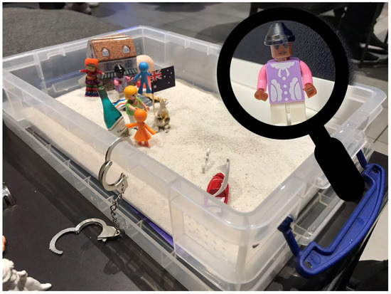 Throughout the fieldwork, the researcher trialed beginning interviews with the sandboxing activity, presenting it in the middle of the interview, and found it best to create our sandboxes towards the end of the interview when we had built rapport. Nine of the face-to-face participants engaged with sandboxing; with one participant, we were limited by time to do that part of the interview. Participants were asked to create a sandbox reflecting what it feels like to be them in Australia or a time when they felt powerful in their body. Both researcher and interviewee created an individual sandbox alongside each other. The researcher provided a plastic tray that was filled with sand, and through symbolism, the use of miniature figures (trees, cars, bridges, animals, fantasy figures, etc.) helped convey their experience and create a reflection of their world. This allowed for participants to reflect on their experiences on a visual and symbolic level. When participants completed their sandbox, the researcher asked the interviewee who they would like to share their sandbox with first. From here, the participants led this part of the interview and typically asked the researcher questions about herself and her sandbox. When participants shared the meaning and significance of their sandbox, this was typically an uninterrupted monologue. This monologue was about meaning given to the miniature figures and sandboxes by the participant and was audio recorded as part of the semi-structured in-depth interview and transcribed. This was followed up with some interview questions and asking again for verbal consent for a photograph to be taken of their sandbox.