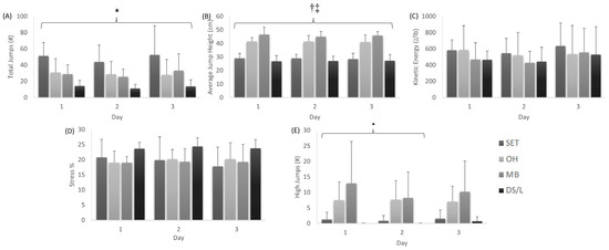 Means and standard deviations for (A) total jumps, (B) average jump height, (C) kinetic energy, (D) stress percent (%), and (E) high jumps. * indicates a difference between SET and DS/L, † indicates a difference from MB and all other positions, ‡ indicates a difference between OH and SET and DS/L, and ‣ indicates that MB and OH were different from SET; all p < 0.05. Note: SET = setters, OH = outside hitters, MB = middle blockers, and DS/L = defensive specialists/liberos.