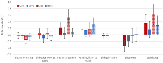 | Sitting in school (h/d) | 5.4 ± 0.4 | 5.3 ± 0.4 | <0.001 | 5.3 ± 0.4 | 5.3 ± 0.4 | <0.001 | |