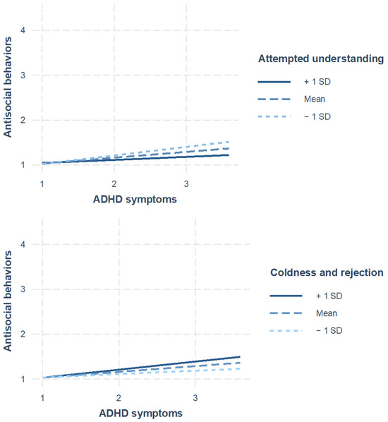 Some patterns in the maternal models were also found in the paternal models. For example, ADHD symptoms significantly predicted antisocial behavior in the models with positive parenting behaviors but not negative parenting behaviors. Moreover, some effects were specific to adolescents’ reports of their fathers. Only one near-significant main effect was found for adolescents’ reports of fathers’ behaviors, namely, attempted understanding (β = −0.15, p = 0.065). Adolescents who reported more paternal attempted understanding tended to report fewer antisocial behaviors. The interaction effect between ADHD and fathers’ attempted understanding was significant, which suggests that adolescents who perceived their fathers as understanding (β = −0.12, p = 0.004) tended to engage less in antisocial behavior. Fathers’ warmth was not a significant moderator (β = −0.08, p = 0.072). Considering fathers’ negative behaviors, one interaction term was significant. The results shown in Figure 2 suggest that fathers’ coldness and rejection moderated the link between ADHD symptoms and antisocial behavior (β = 0.11, p = 0.011), enhancing the severity of adolescent antisocial behavior. No significant interaction effect of fathers’ angry outbursts was observed (β = 0.05, p = 0.206).