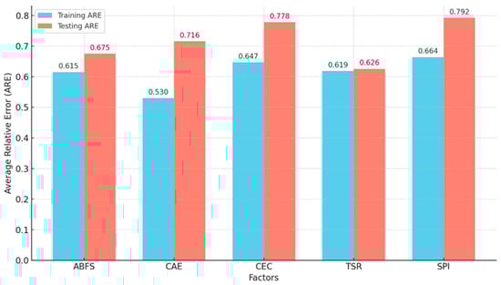 In the testing phase, the SSE increased to 97.691 and the ARE to 0.714, reflecting challenges in generalizing to unseen data. TSR achieved the lowest testing error (ARE: 0.626), followed by ABFS and CAE (AREs: 0.675 and 0.716, respectively), while CEC and SPI had the highest errors (AREs: 0.778 and 0.792) (Figure 3). This discrepancy between the training and testing errors suggests potential overfitting, where the model aligns too closely with training data but struggles with generalization. SPI’s consistently high errors indicate inherent complexity or insufficient feature representation. However, high errors in the variables under CEC and SPI may stem from the subjective and context-dependent nature of these constructs. The respondents may have interpreted terms like “engagement”, “collaboration”, or “policy integration” differently based on personal experience, leading to inconsistent responses. Additionally, these variables often involve multi-stakeholder perspectives and long-term impacts, making them harder to quantify. Limited awareness of policy frameworks or ongoing sustainability initiatives could also affect response accuracy. Ambiguity in survey items, cultural bias, or lack of prior exposure to community projects may further contribute to variance and higher error rates.