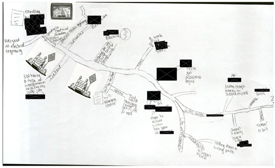 In nearly all cases, significant people appeared in both the visual maps and the verbal interviews, allowing participants to make meaningful connections between the two methods. Jamel, for example, wrote on his map that his “dad pushed me in this direction” toward his side road titled “specifically electrical engineering.” During the interview, he elaborated on how his father encouraged him to pursue this career by pointing out his interests and strengths Similarly, Dev used the “GPS” sticker to symbolize his sixth-grade teacher, who provided early guidance and direction toward his future aspirations in engineering.