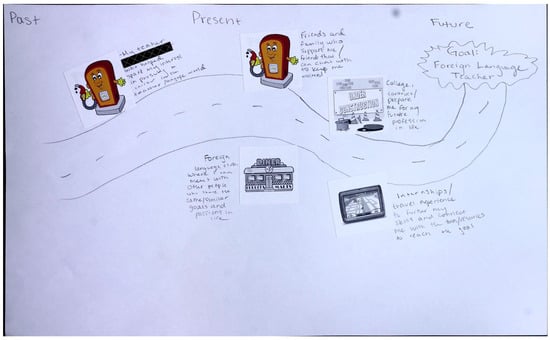 Several participants mapped significant people and events that previously impacted their purpose, mostly throughout childhood, in a section labeled “Past.” For example, one student, Neil, mapped a close family member who served as a role model for his purpose: “During my childhood, I wanted to help others, like my father, who’s a nurse.” His map reflected how this early exposure to a helping profession informed his early aspirations. Similarly, Myles noted an influential teacher on his map who “sparked [his] interest in language” and helped him realize his ambition to become a world language teacher: