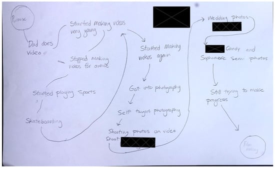 In addition to the affirmation and guidance they received, participants described the importance of shared activities with influential people in their lives. These activities were often related to pursuing aspirations or purpose and went beyond mere advice, involving active participation and engagement. For example, Martin shared how his father supported his interests in photography, even though his father wasn’t familiar with the field: my dad isn’t a photographer at all, so I would basically self-teach myself photography. And then I started going with my dad on, like, video shoots and shooting photos.” Martin highlighted this shared experience with his father by writing the name of a local candy company on his map. During the interview, he elaborated that he had accompanied his father on a commercial video shoot for the company, where he took photo stills that were eventually used in an advertisement. Kayla described a similar experience of receiving support from her guidance counselor, who actively helped her bring an idea to life: