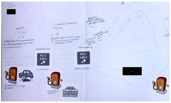 Participants frequently visualized not only their academic and career goals but broader life ambitions, such as starting a family or building relationships. The stickers provided during the mapping exercise served as valuable tools for identifying key influences, and students frequently elaborated on these visual elements during the interviews. For instance, Steven used the gas station sticker to represent his father’s encouragement to pursue baseball, and the diner sticker to illustrate the social influences of his friends.