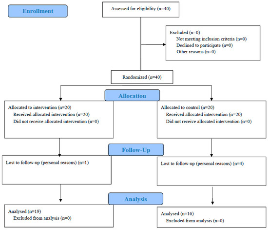 Figure 1 displays a Consolidated Standards of Reporting Trials (CONSORT) diagram of the levels of reporting and participant flow for the study (Schulz et al., 2010). We performed an a priori sample size calculation for the SLJ test, contrasting intervention and control groups. We set the type I error rate at 0.05 and the statistical power at 80%. The estimated effect size of Cohen’s d = 0.97 is based on a recent study by (Abdelkader et al., 2022). The analysis indicated that a total of 17 participants would represent a sufficient sample. To account for potential participant attrition, thirty-five postpubertal male soccer players were randomly assigned by blinded evaluators to either the experimental training (ET) group (n = 19; age = 16.39 ± 0.46 years; maturity offset = 2.43 ± 0.47 years) or the active control group (CG) (n = 16; age = 16.53 ± 0.48 years; maturity offset = 2.51 ± 0.40 years). All participants were considered experienced players with an average of 6.0 ± 1.8 years of systematic soccer training, which included four to five training sessions per week. Additionally, all participants were in good health and had no musculotendinous injuries during the season leading up to the start of the study. All participants were engaged in their regular in-season soccer training and competition schedules throughout the study period. No additional organized physical activities were permitted outside of the intervention and regular soccer training. All anthropometric measurements (Table 1) were conducted by the same researcher to ensure consistency. Body height was measured from the floor to the vertex of the head using a stadiometer (accuracy: 0.1 cm; Hotain, London, UK), and body mass was recorded using a digital scale (accuracy: 0.1 kg; Tanita BF683W, Munich, Germany). During all measurements, participants were barefoot and wore shorts only.