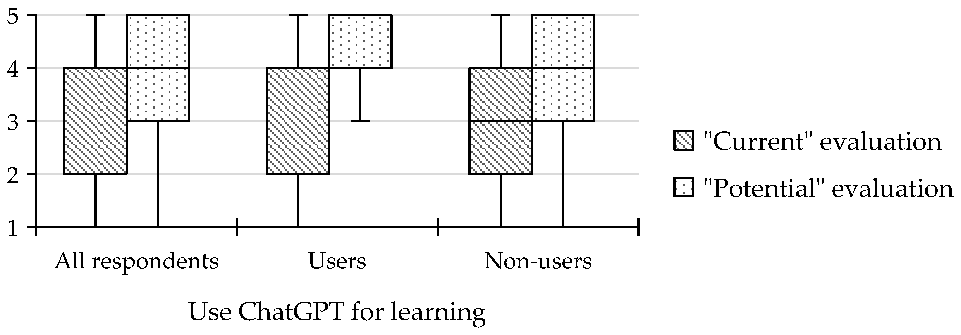 4.1. Perception of “Current” and “Potential” Usefulness of ChatGPT in Education