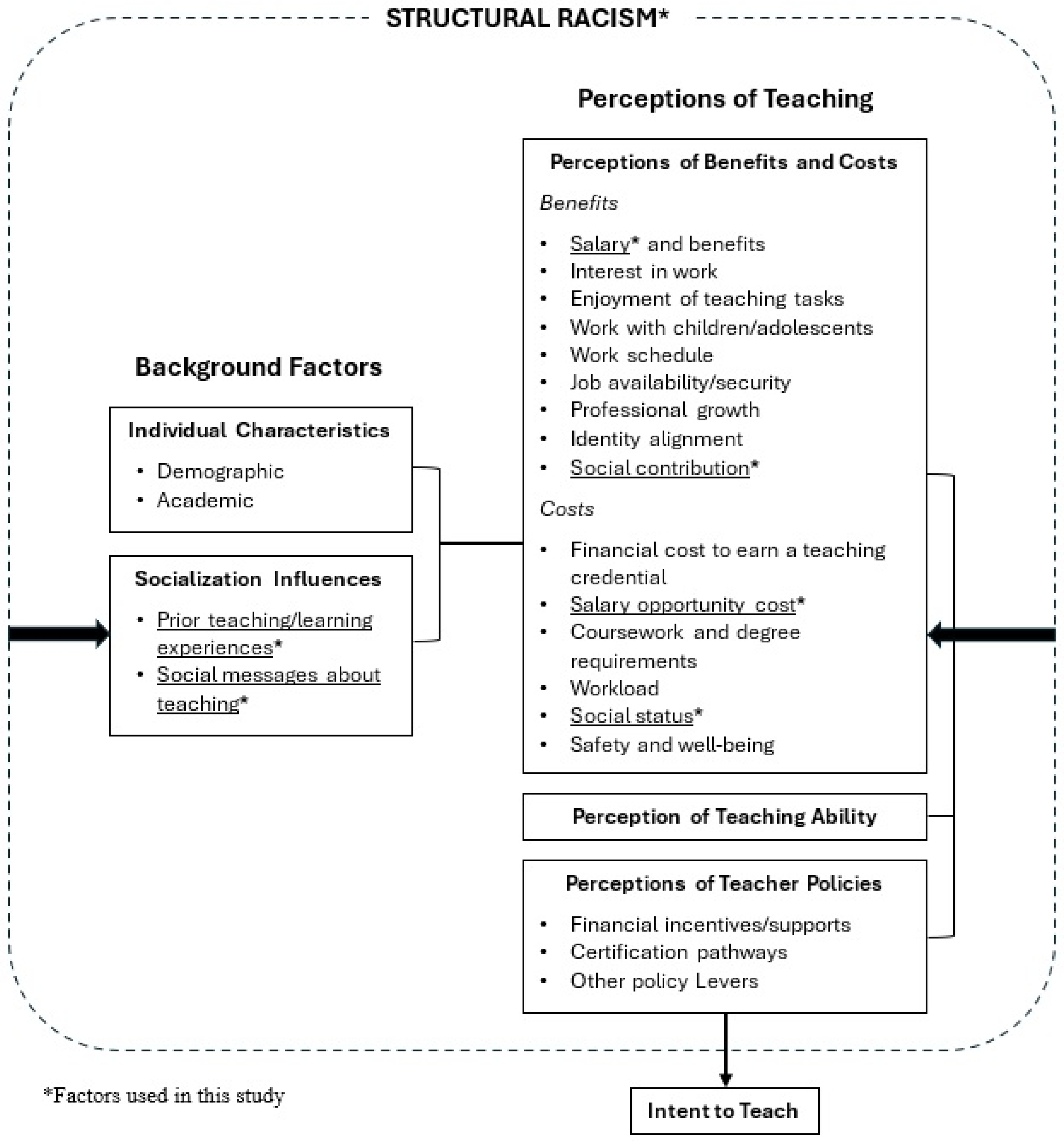 Figure 1) includes an adaptation of the Factors Influencing Teaching Choice (FIT-Choice) scale and the broader concept of structural racism.