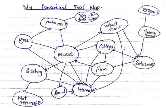 Throughout the course, participants submitted two anonymized assignments. In the first assignment, participants were asked to keep a food diary for 1 week, noting all meals and snacks. For consistency with the broader MiFood research project on food security, the Household Dietary Diversity Score (HDDS) was used to analyze the food diaries. The second assignment was for participants to create geographical and conceptual food maps. The purpose of the food maps was to help participants identify where they can obtain food in their community. Participants were asked to consider and include on their map the prices of food, types of food, where the food comes from, infrastructure barriers, and accessibility. Overall, the food maps created by participants highlighted where they sourced their food and any barriers they encountered. Figure 3 provides an example of a participant’s conceptual food map.