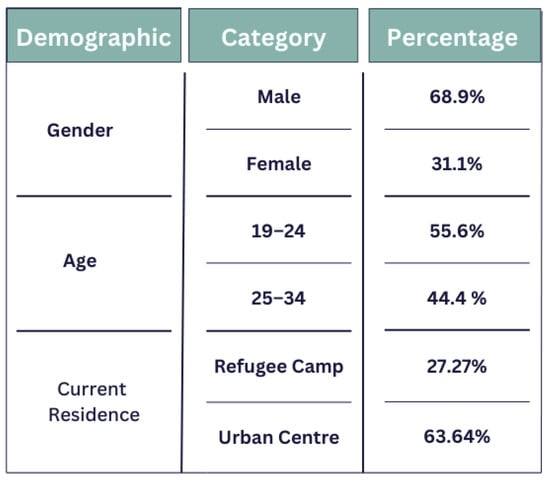 Refugees living in urban areas are often not registered with UNHCR, and as they are also highly mobile, it is not easy to estimate exact numbers (Easton-Calabria et al., 2022; O’Callaghan et al., 2019; Perry, 2024). In fact, urban refugees can become somewhat invisible as they are “absorbed into the urban fabric, dispersed over the city, and highly mobile” (UNHCR & World Bank, 2020). Indeed, the authors’ previous study verified that refugee youth move between communities (see Enns et al., 2024). When we returned to offer the training platform to the original participants, community leaders reported that a majority of the youth had moved. Although youth may live in an urban centre for a time, they may also move between urban areas, their country of origin, rural areas and camps. Despite this fluidity in residence, available data indicate that refugees residing in Nakuru, Kenya, are predominantly from South Sudan (Pape et al., 2021). The figures for Nakuru highlight the significant challenges faced by South Sudanese refugees when residing in urban areas. In Nakuru, 55 percent of the refugee population is under 18 years of age, compared to 41 percent in the host community (Pape et al., 2021), and young adults often lead households.