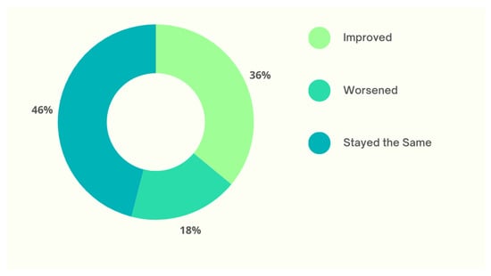 Measuring dietary variety is insightful because it is directly linked to food security. Dietary variety declines as food security declines (Onyango et al., 2023). As seen in Figure 6, 46 percent said their diet has less variety than when they were in South Sudan. However, only 18 percent said the nutritional quality of the food they eat has worsened (See Figure 7). These graphs highlight the wide spectrum of food security challenges that refugee youth face. They also indicate where to focus interventions.