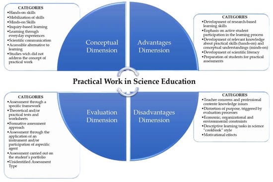 The SLR made it possible to identify four major dimensions associated with the dynamics of practical work in science education: (1) the conceptual dimension; (2) the advantages dimension; (3) the evaluative dimension; and (4) the disadvantages dimension. Figure 4 provides a synthesis of these results.
