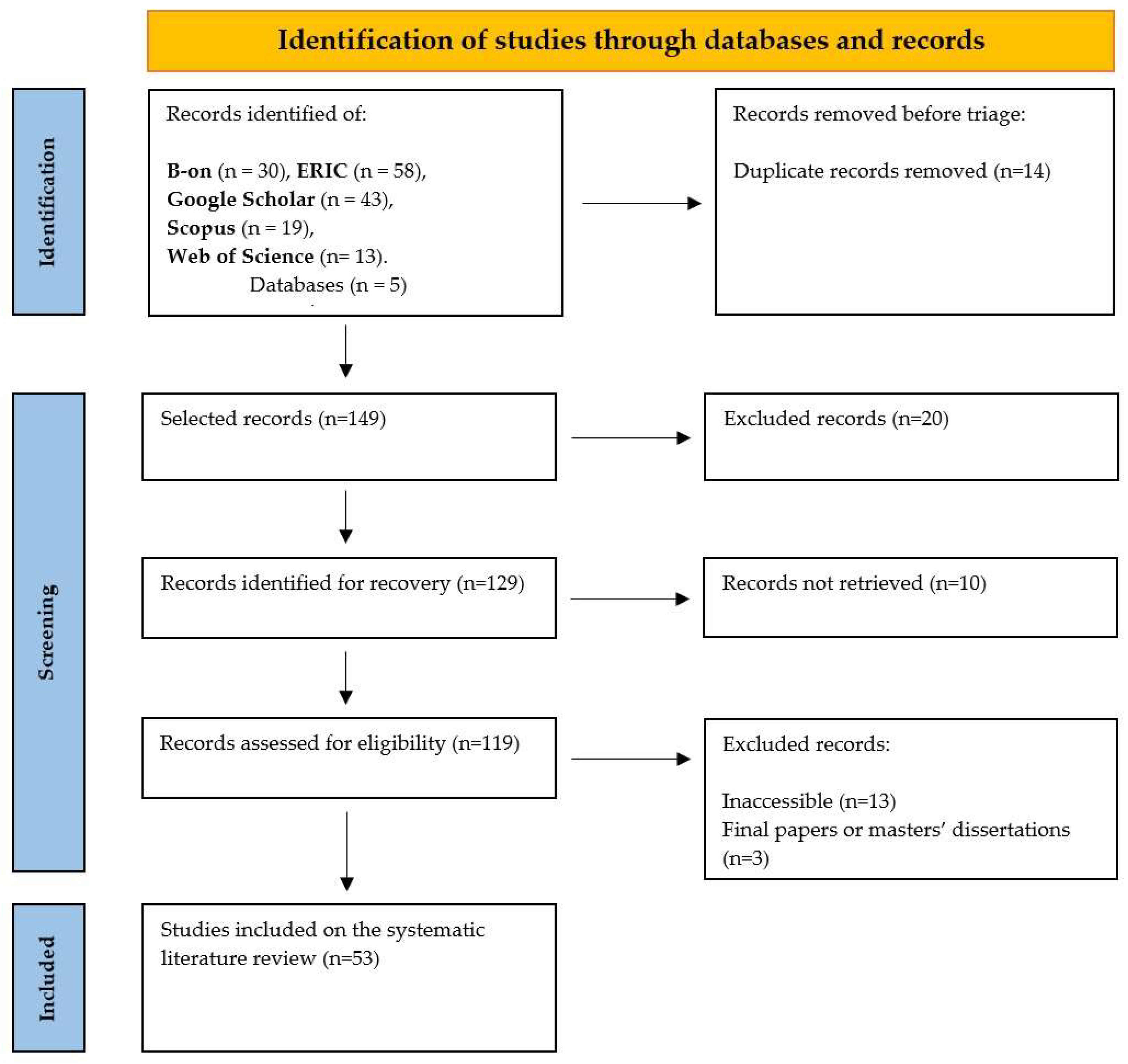 | Exclusion criteria | Systematic literature reviews; undergraduate theses or final reports; master’s dissertations; documents published prior to 2011. |