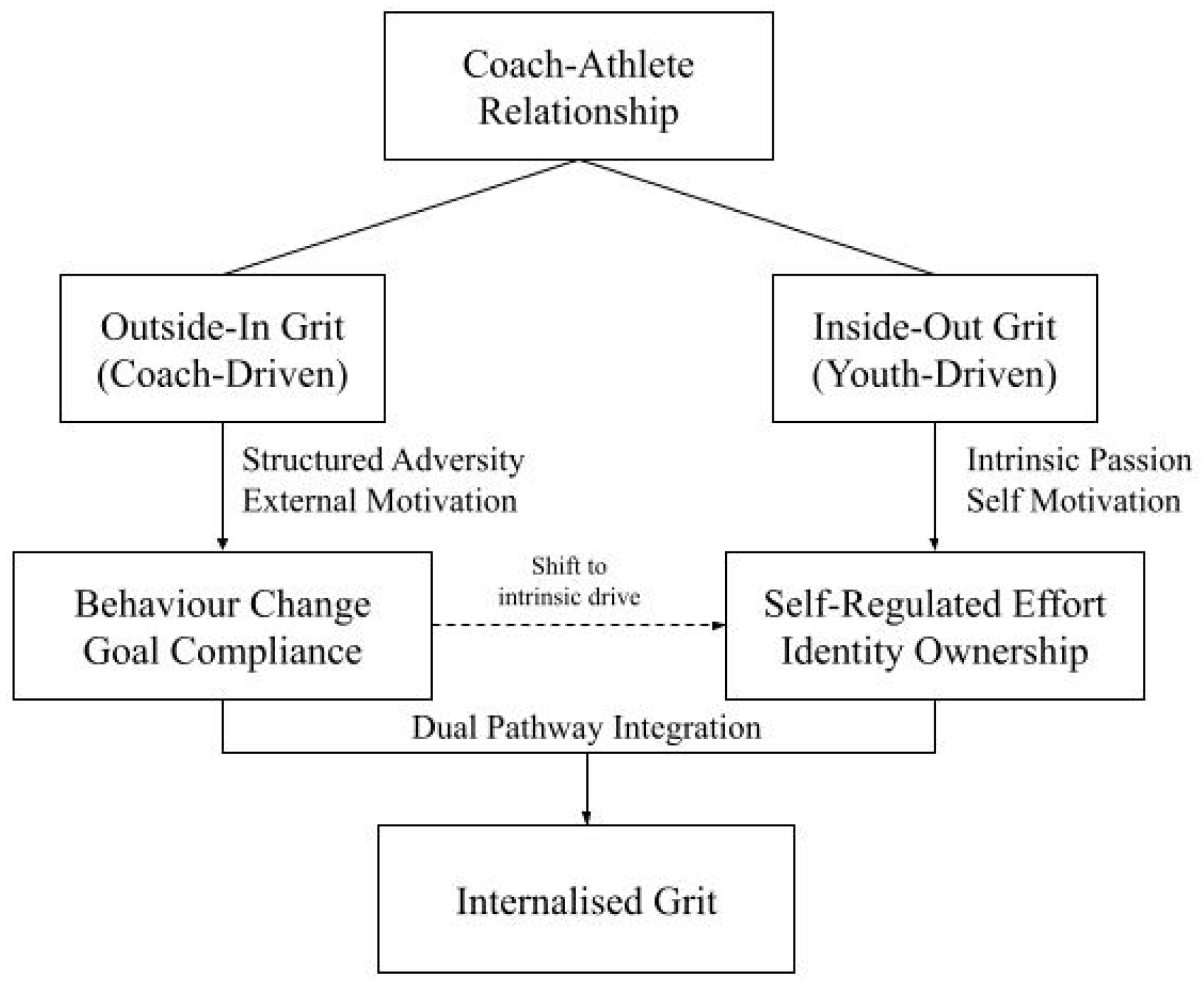 Figure 1 presents the Dual Pathway Model of Grit Development in Youth Coaching. Rooted in the coach–athlete relationship, this framework illustrates two primary developmental trajectories: outside-in grit, which is coach-driven and shaped by structured adversity and external motivation, and inside-out grit, which is youth-driven and fueled by intrinsic passion and self-motivation. Youth who begin with external compliance and behavior change often experience a shift toward self-regulated effort and identity ownership, marking the transition from outside-in to inside-out grit. This internalization process is depicted by the dashed arrow labeled “Shift to intrinsic drive.” Ultimately, both pathways converge in the “Dual Pathway Integration” phase, culminating in Internalized Grit—a sustained, autonomous perseverance that reflects a mature developmental outcome. This framework integrates findings from this study and aligns with both Self-Determination Theory and Positive Youth Development principles.
