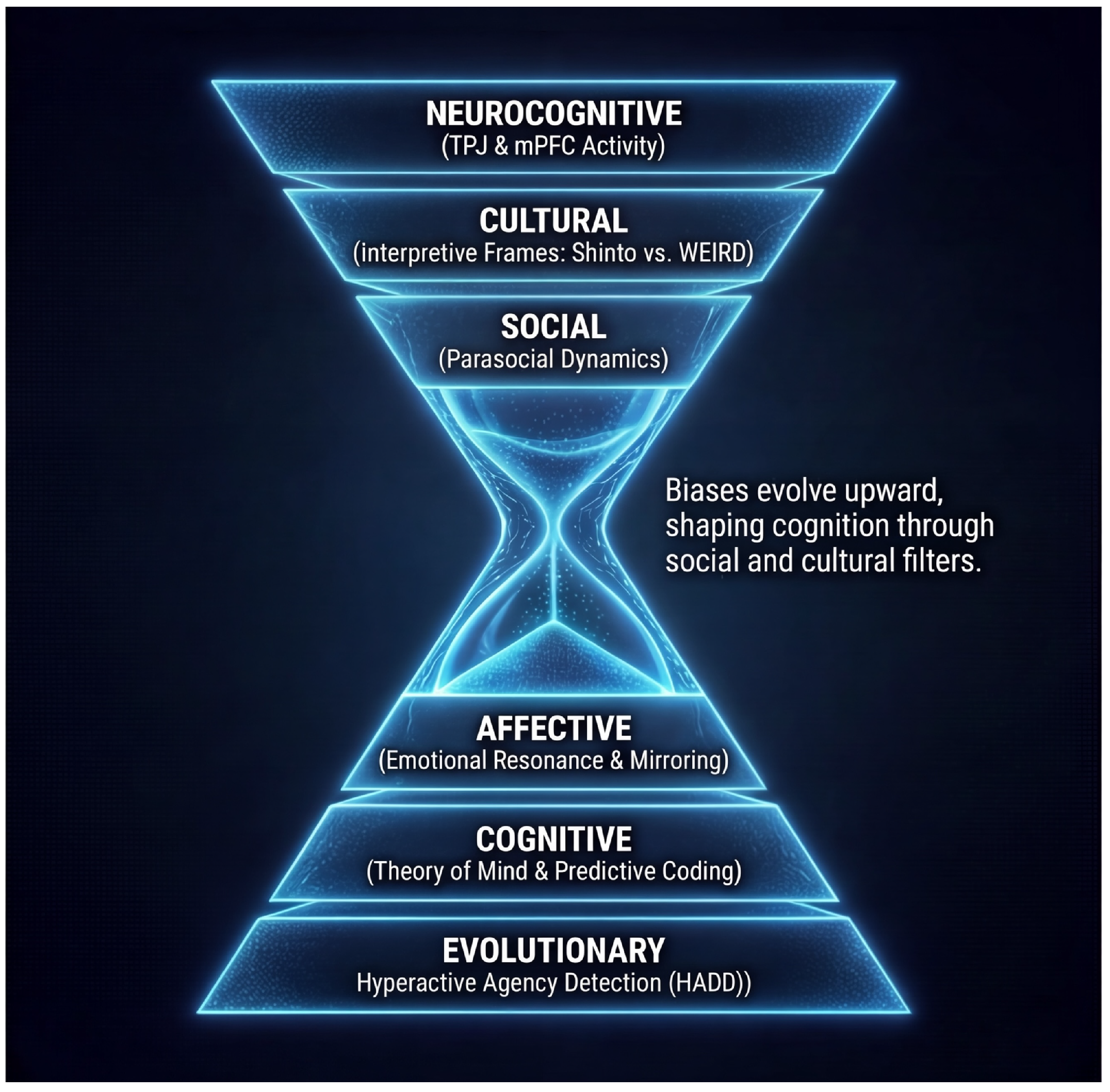 Figure 1). Broad evolutionary predispositions narrow through cognitive and affective filters to a situated parasocial interaction with a particular agent; that interaction then fans outward again through cultural interpretation and individual neurocognitive particularities, yielding heterogeneous subjective realities.