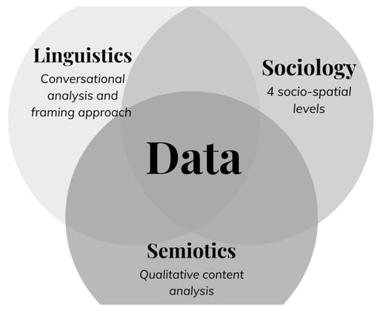 This pluridisciplinary study (Figure 1) is based on the contributions from three disciplines: Linguistics, sociology and semiotics. The linguistic approach to the data is dual. First, a conversational analysis framework [,] is used, which enables us to identify various “voices” used by young people. Secondly, the framing approach in ref. [] paved the way towards a better understanding of young people’s relationship with the school institution. To achieve this, we adopted a qualitative analysis of the data combined with a lexicometric approach (using Sketch Engine). For the sociological approach, we adopted [] four socio-spatial levels of analysis to understand the various references evoked by young people. A third semiotic approach was used to support and complement the conversational analysis and sociological approaches. Inspired by [,] narrative semiotics, we conducted a qualitative content analysis of the focus group transcripts. This analysis identified some general patterns regarding the attribution of roles of those who cause climate change (“the villains”: []), the actors working against it (“the heroes”), the social actors who create obstacles to the heroes’ action (“the opponents”) and those who support the heroes (“the helpers”). The results of these three approaches are examined in the following sections.