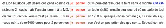 A lexicometric analysis of the occurrences of the lemma “déchet” makes it possible to detail its use by the speakers. The most frequently occurring verbs of which “waste” is the object include “to sort”, “to throw out”, “to keep”, “to remove” and “to collect”. Sorting, throwing out, keeping, removing and collecting represent the concrete actions confirming the concrete representation of the climate issue in the daily lives of young people and the fight against climate change in which they can, thanks to waste management, actively participate because of its accessibility. In addition to the acts (of sorting, throwing out, keeping, removing and collecting) in their daily life, they also share personal beliefs and attitudes that go beyond these simple gestures. A concordance analysis of the data shows that young people do express their personal beliefs in the focus groups, mainly using “je pense” (44 occurrences in Figure 3) and “je crois”, with the pronoun “je” often reinforced by “moi” (“moi je”, Figure 4).