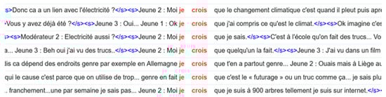 One or more mediators were responsible for the smooth running of the exchanges, but it was, first and foremost, the participants who were invited to discuss among themselves. We know that, during group discussions, the same young people tend to do most of the talking. The moderators tried to give everyone a fair chance to speak. However, some of the young participants, either through lack of interest or shyness, participated less, while others asserted their ideas more clearly. These limitations of our research study will be discussed in the final section of this article. The mediators also helped to maintain a certain regularity between the different focus groups, particularly with the help of the constructed interview grid already mentioned, composed of follow-up questions around four themes related to young people and climate change: Their perception of climate change, their role in the climate transition, their relationship with school and their access to information. Focus groups were all audio recorded, anonymised and transcribed; the transcription is the basis of our analysis.