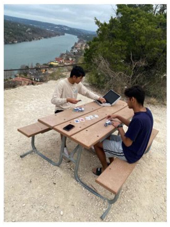 Blue’s photo for mental health and well-being Photovoice prompt. Note that the caption is written by Blue: This shows two Asian kids gambling the night before a big test in order to take some of the stress away. This picture was taken to document the serenity of the environment, the sort of calm before the storm before the big test that would determine the grade the boys would receive in their [Management Information Systems] course.