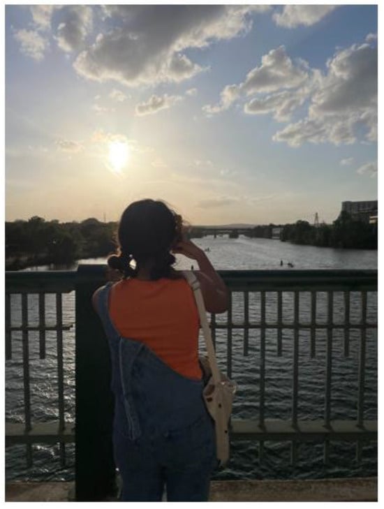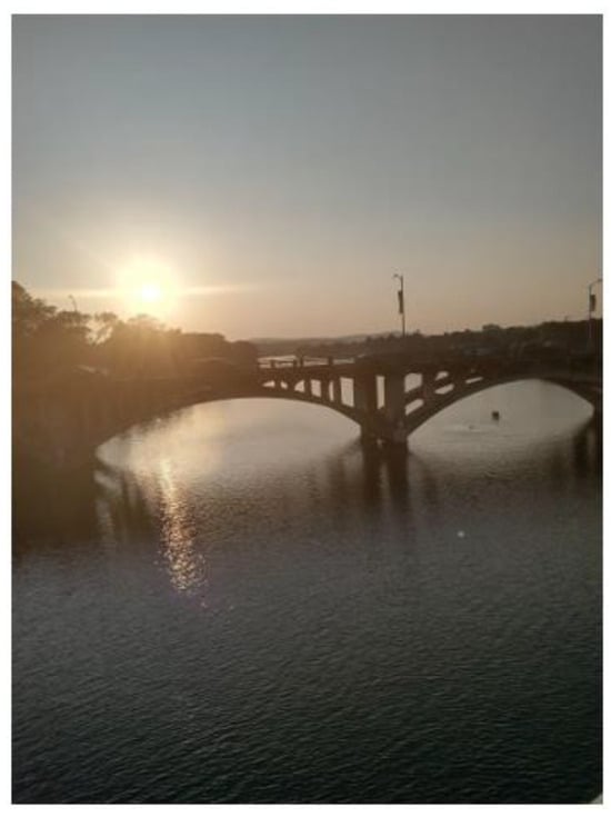 Participants described the connection between their mental health and with the environment, particularly highlighting the influence of being outside in nature. For example, Blue’s photograph (Figure 4) emphasized the “serenity of the environment” as he played poker at the top of Mount Bonnell. Redacted also shared a photograph (Figure 5) of a scene he took while on a walk and described how “being outside helps [de-stress] from studying”. Spencer chose to share two photographs depicting the relationship between environmental connectedness and her mental health. In Figure 6, she describes going on walks with peers in nature, and in Figure 7, she is seen taking a picture of the sunset at Lady Bird Lake and she remembers it as “a very happy moment for me. And I think my mental health was great at the time”. Spencer also shows how she relies on nature for health when describing that she will view photographs taken in nature when she needs a “pick-me-up”. Spencer’s admission exemplifies both her connection to nature and her insight into what helps her during difficult times, demonstrating her resiliency as well.