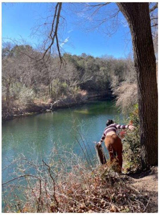 Spencer’s photo (a) for mental health and well-being Photovoice prompt. Note that the caption is written by Spencer: My friend leans over to look closer at the water at Zilker Park. Walking in nature, and chatting with friends, is the ultimate relaxation. We talk about our weeks, our struggles, our joys, anything is fair game. It is so comforting and encourages me to keep going.