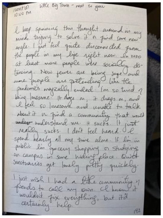 Many participants described how the COVID-19 pandemic and associated policies (e.g., stay-at-home orders) affected their mental health by obstructing their social connectedness, adding pressure to their family relationships and home environments, and limiting their ability to build and maintain social networks. Roman, for example, described added “tension and friction” with his family, and both Roman and Hazel discussed navigating isolation related to the pandemic. Additional consequences of the COVID-19 disruption to connectedness include the ambivalence and anxiety produced in re-learning how to socialize within a highly uncertain time composed of rapidly shifting and sometimes contradictory policies, incongruence between governmental agencies, and continued widespread disease. Hazel took a photo of one of her diary entries (Figure 12) describing this cycle of feeling lonely yet feeling anxious about the possibility of contracting COVID-19. She provided the following description to accompany her photo: