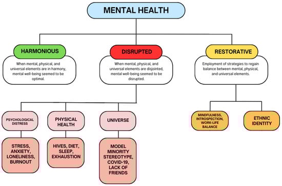 Following a similar approach to Byrne [32], the authors developed a concept map (Figure 15) to depict how data items relate to their respective themes. The process of developing this concept map revealed how AsA mental health was dependent on the cohesion of mental, physical, and universal (i.e., social and environmental) connectedness. When these elements were in harmony, mental health seemed to be optimal. Conversely, when these elements were disjointed, mental health was disrupted. A third concept of restoration became apparent, wherein AsA emerging adults employed various strategies in attempts to regain balance between mental, physical, and universal connectedness. This concept map will guide the discussion of our findings.
