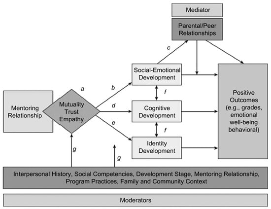 Rhodes’s mechanisms of mentoring model of youth mentoring reflects a combination of elements from the previous two models and adds important details like interpersonal history and community context [8,10]. The final result is an equation-like depiction, which can be seen in Figure 3 below [11]. We refer to this model as the “mechanisms of mentoring model”, as it is the only one of the three models to include an equation-like series of events that lead to theorized outcomes (social–emotional development, identity development, and cognitive development). Rhodes’s model complements Spencer’s work by highlighting mutuality, trust, and empathy as essential precursors to positive change while also reflecting Keller’s perspectives on how mentoring can influence parental and peer relationships, depicted as mediating outcomes.