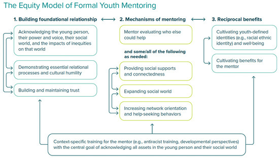 Although Keller’s systemic model of mentoring [8], Rhodes’s model of youth mentoring [55], and Spencer’s [6] relational processes in youth mentoring are highly influential models that have stood the test of time, we believe that the field grows when updated theoretical models are put forward. After deep examination of previous theoretical models, conversation with their authors, and reflection on what is missing from these important works, we propose a new Equity Model of Formal Youth Mentoring. Although we believe there are valuable pieces in here that are applicable to many different iterations of mentoring, the Equity model is most relevant to formal mentoring (as in matching young people with mentors they do not already know) for adolescents and young adults. We believe that this model, guided by the above values, promotes equitable support to young people, in that it may be particularly helpful in supporting minoritized or otherwise marginalized young people in living healthy and meaningful lives. The following sections walk through the background literature and give an explanation for the inclusion of each aspect of the Equity model seen in Figure 1.