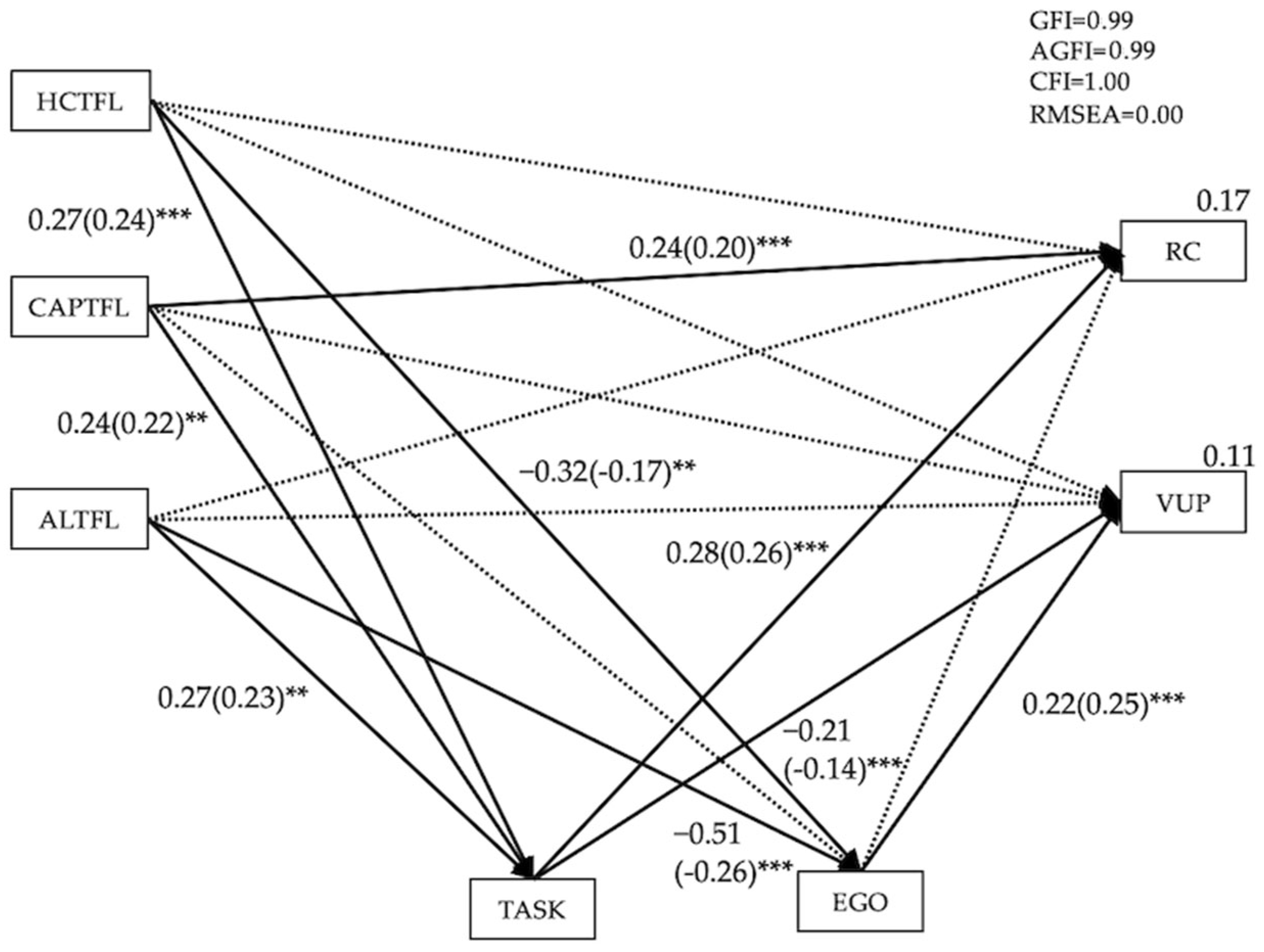 Indirect effects were examined using bias-corrected bootstrapping with 5000 resamples. HCTFL showed significant indirect effects on RC through TASK (B = 0.07, β = 0.06, p < 0.001) and on VUP through both TASK (B = −0.06, β = −0.03, p = 0.009) and EGO (B = −0.07, β = −0.04, p = 0.009). CAPTFL showed a significant indirect effect on RC through TASK (B = 0.07, β = 0.06, p < 0.001) and on VUP through TASK (B = −0.05, β = 0.03, p = 0.009). ALTFL demonstrated significant indirect effects on RC through TASK (B = 0.07, β = 0.06, p < 0.001) and on VUP through both TASK (B = −0.06, β = 0.03, p = 0.009) and EGO (B = −0.11, β = −0.07, p = 0.009).