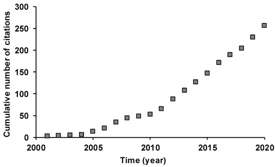 Published works reporting on the activity of tree volatiles on PPM behavior and the influence of PPM herbivory on pine volatile composition were compiled using the Web of Science search engine, in all available databases, using the keywords “volatile” and “Thaumetopoea” or “processionary moth”. The eight reports retrieved dated from 1999 to 2020 and were published in journals specialized in the scientific fields of Plant sciences (63%), Entomology (25%) and Environmental Sciences (25%). These works generated 267 citations by a total of 240 works, with an average of 33 citations per work. The reports that cited these works were published in journals specialized in the scientific fields of Environmental Sciences (88%), Plant sciences (83%) and Forestry (71%). Since 2011, the cumulative number of citations has been steadily increasing, revealing a stable research interest in this field (Figure 1).