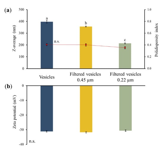 Physicochemical measurements were carried out with different populations of vesicles. A selection by size was made by filtration with the objective of providing suitable vesicles with different sizes depending on final application. Three vesicle populations were determined, one with an average hydrodynamic diameter of 400 nm without filtration, and the other two with lower average hydrodynamic diameters after filtration of 0.45 µm (355 nm) and of 0.22 µm (200 nm) (Figure 1a, bar charts). Polydispersity indexes about 0.4 did not change with the different filtrations (Figure 1a, line). In the same way, the zeta potential values were also not modified with the filtrations and a negative value about −30 mV was stablished for membrane vesicles (Figure 1b).